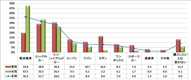 ◇もし車を購入するなら?:男性「エコ・ハイブリッドカー」30.6% 女性「軽自動車」47.5