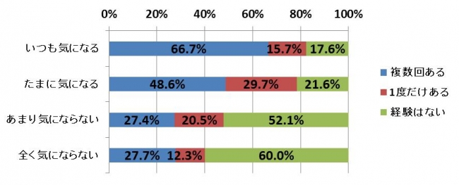 運転中の自分の携帯電話への意識と直近1年間に交通事故になりそうになった経験(ヒヤリハット経験)の関係性を調査したところ、運転中でも自分の携帯電話 がいつも気になると答えた人の82.4%、たまに気になると答えた人の78.3%と、運転中に自分の携帯電話が気になる人の約8割がヒヤリハットの経験を しているということがわかりました。一方で、全く気にならないと答えた人の6割がヒヤリハットの経験がないと答えていることからも分かるように、やはり、 運転中の携帯電話への意識は、事故と関連があると言えそうです。運転中は携帯電話を気にならない場所に置くなど、運転に集中できる環境を整えることも大切です。