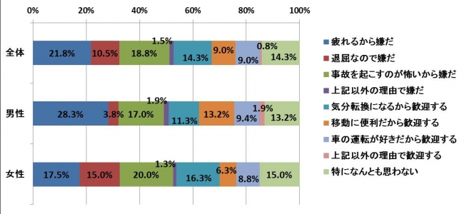 勤務中に仕事として自動車を運転することについてどのように思うかを聞いたところ、全体では「嫌だ」と回答した方が52.6%となり、半数以上の方が「嫌 だ」と回答した結果となりました。男女別で最も多い回答は、男性は「疲れるから嫌だ」28.3%、女性は「事故を起こすのが怖いから嫌だ」20.0%と なっています。男女とも勤務中に仕事としての運転は避けたいようです。