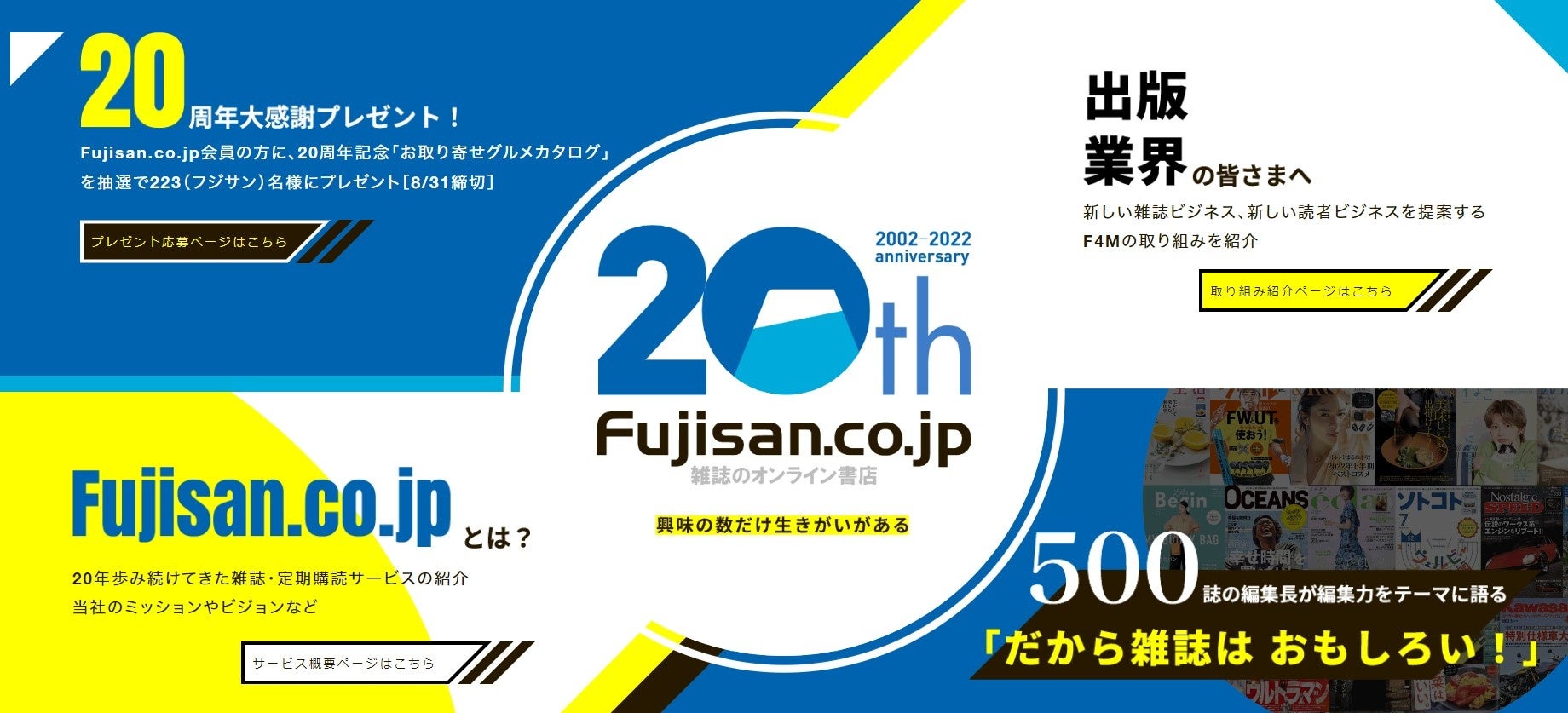 雑誌の定期購読を軸に会員型ビジネスを展開する株式会社富士山マガジンサービス(本社:東京都渋谷区、代表取締役:西野伸一郎 以下、富士山マガジンサービス)は、2022年7月12日に創立20周年を迎えます。20周年を記念して特設ページを公開し、雑誌編集長500人へのインタビュー記事、およびオンライン書店「Fujisan.co.jp」のお客様に感謝の気持ちを込めてプレゼントキャンペーンを用意しました。
