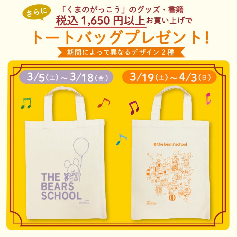 くまのがっこうグッズ・書籍を税込1,650円以上お買い上げの方に、オリジナルトートバッグをプレゼント。
