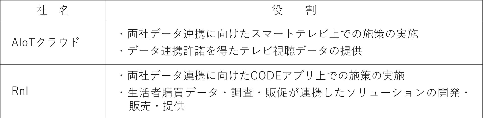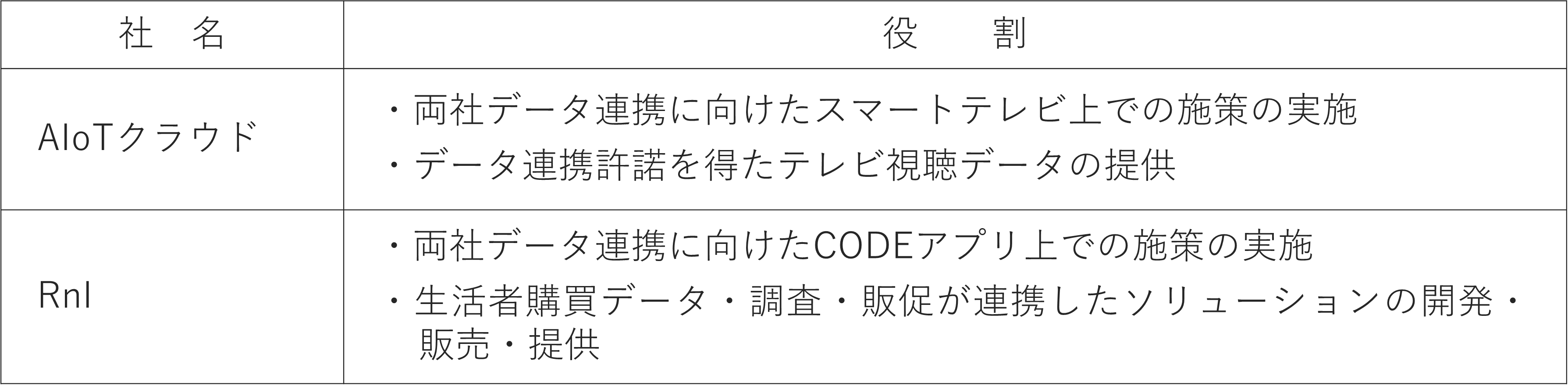 そこで、AIoTクラウドの保有するスマートテレビの視聴データと、RnIの保有する商品購買データに加え、両社のテクノロジーやノウハウなどを相互活用し、統合分析することによって、メーカーや小売企業に対して新たなマーケティング支援サービスを提供してまいります。