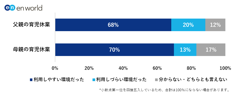 育休利用者への「利用環境」に関する質問では、男女ともに7割近くが「利用しやすい環境だった」と回答。【図5】
