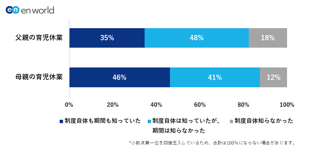 「育児・介護休業法」に関する全体の質問では、制度自体の認知が「父親の育児休業」で83%、「母親の育児休業」で87%と、それぞれ8割を超えました。一方、育児休業の最長取得期間の認知については、「父親の育児休業」で35%、「母親の育児休業」で46%と、いずれも半数を切る結果となりました。【図1】