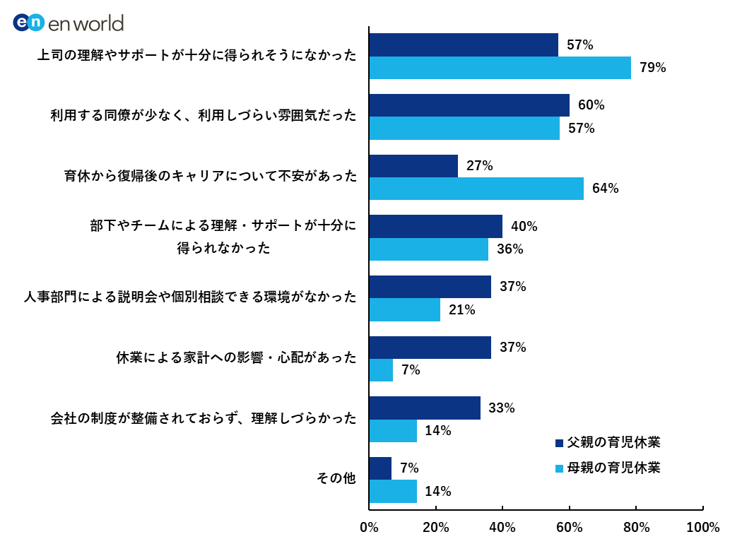 次に、「利用しづらい環境だった」理由に関する質問では、全体で「上司の理解やサポートが十分に得られそうになかった」(64%)が最多、次いで「利用する同僚が少なく、利用しづらい雰囲気だった」(59%)となりました。さらに男女別に見ると、「母親の育児休業」では「育休からの復帰後のキャリアに不安があった」(64%)が2番目に多い結果に。女性の休業期間が比較的長期になることからも、キャリアへの不安を抱きやすいことが明らかになりました。一方、「父親の育児休業」では「休業による家計への影響・心配があった」(37%)の回答が多く、家計を支える男性にとって育休利用のハードルが高いことが分かりました。【図7】