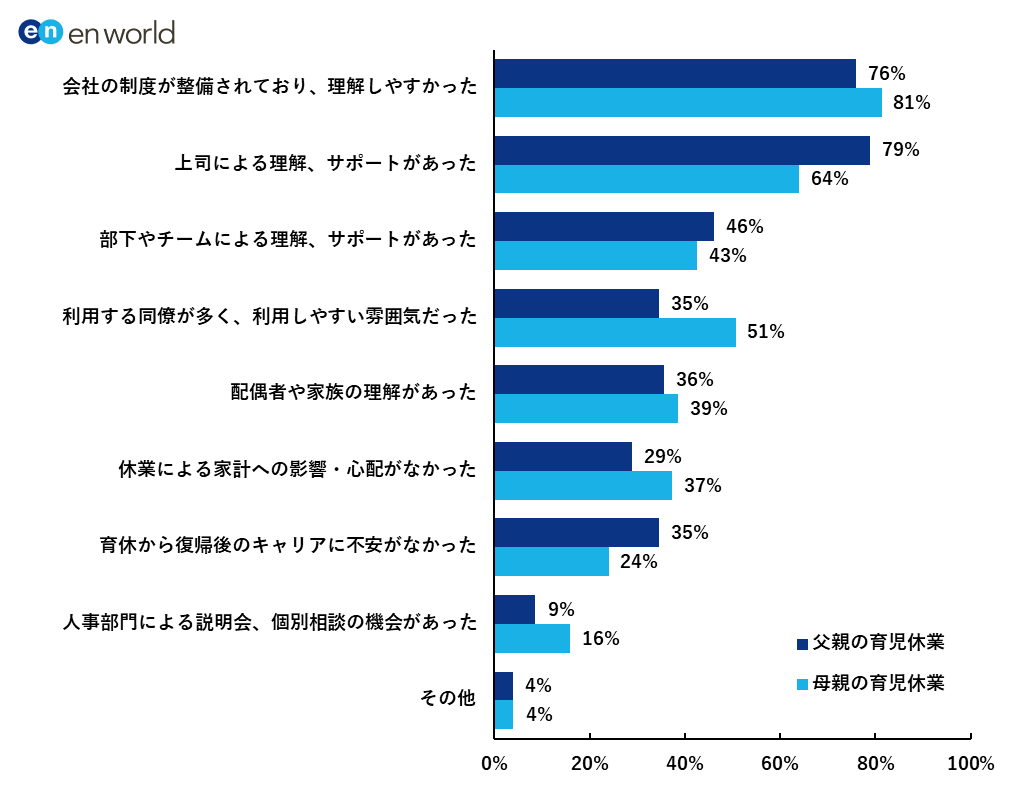 - 「会社の整備体制」「上司の理解・サポート」が従業員の育休利用を推進