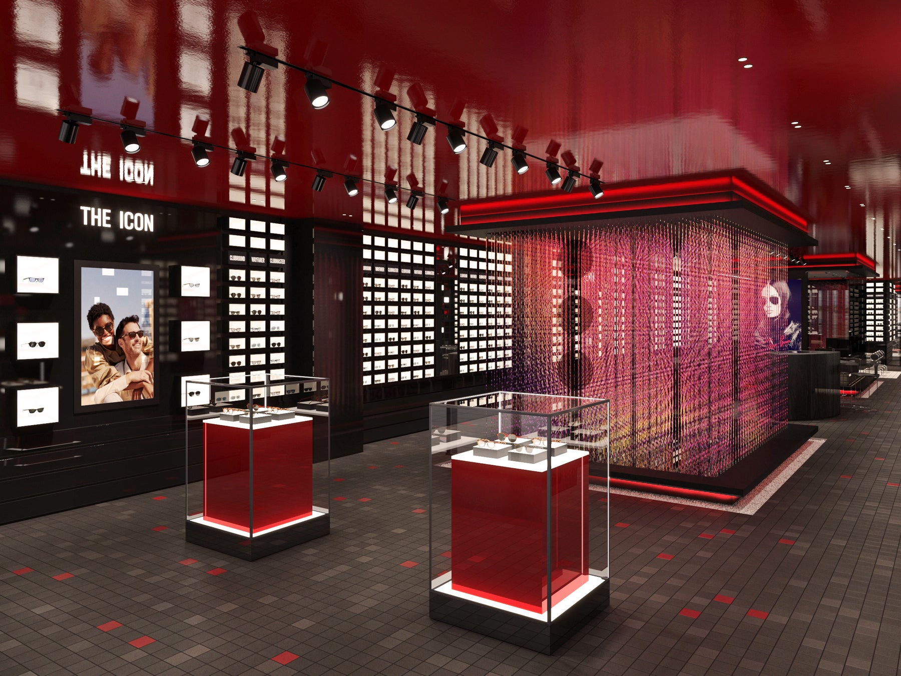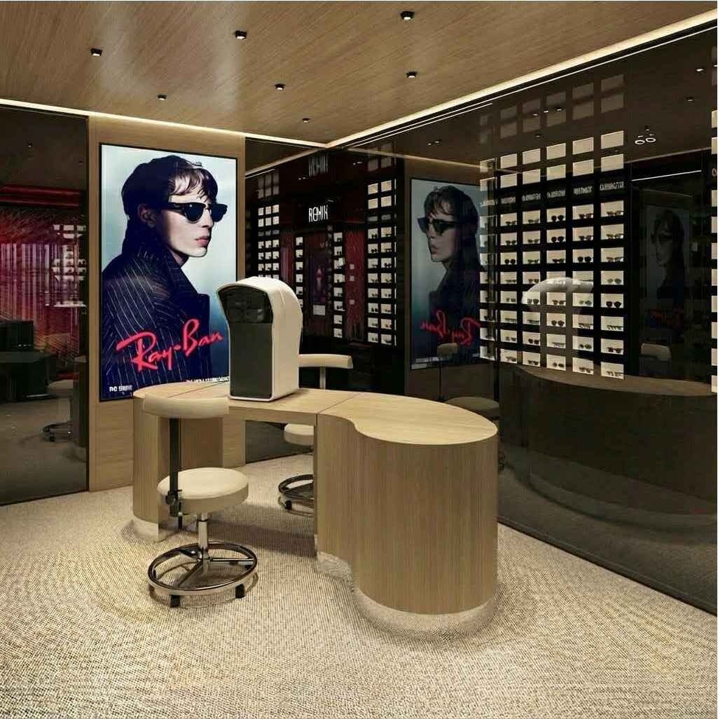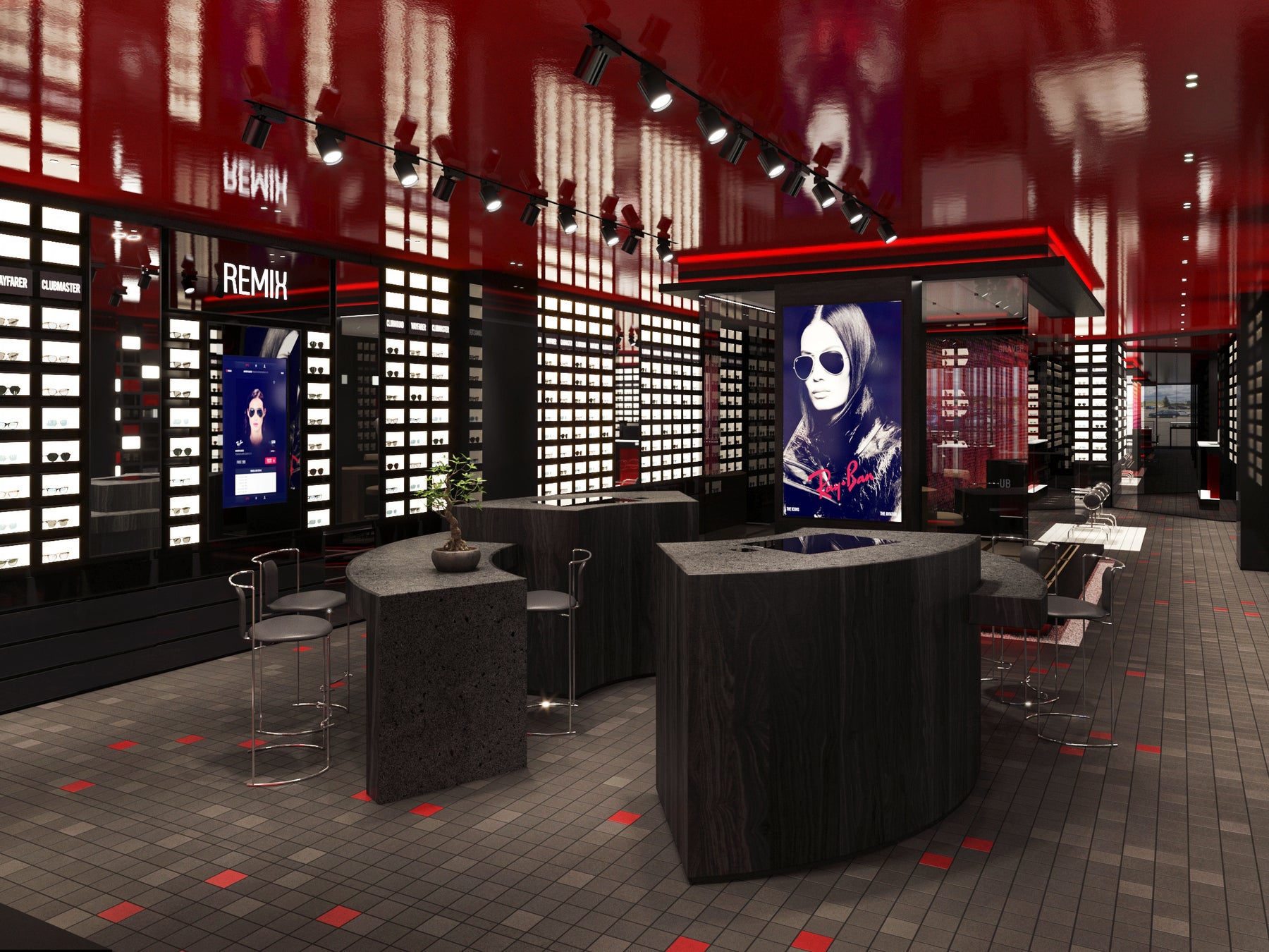 270㎡の店内にはブランドカラーであるアイコニックな赤と黒を基調としたシックな内装に、伝統的な日本の要素を取り入れています。本物の溶岩タイルを使用したフロアは、自然が持つ力強い美しさを表現しています。ブランドのシグネチャーカラーでもあり、日本の美意識へのオマージュでもある赤い天井は、空間全体に温かみと独特の個性を添えています。日本庭園をイメージした木目調のインテリアを使用した検眼室の壁にはスマート調光機能を搭載したスモークガラスを使用しており、より落ち着いて検眼を受けられるプライベート空間を保ちます。