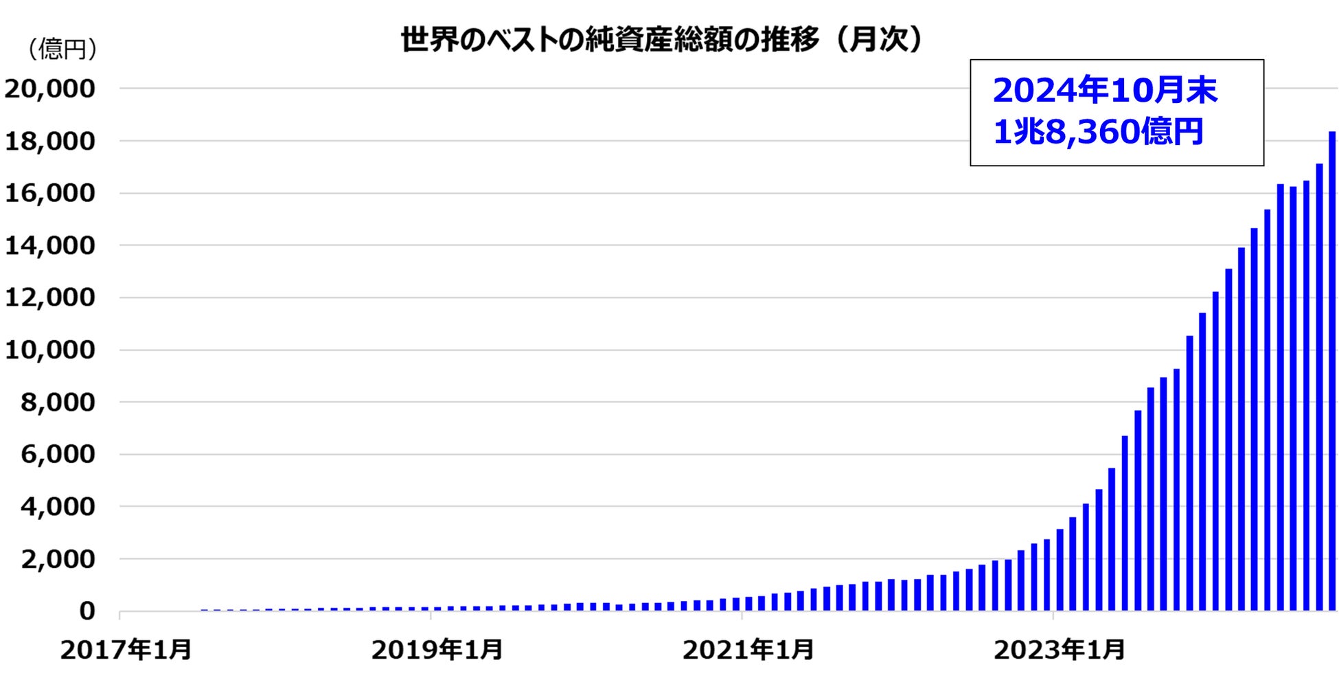 インベスコ・アセット・マネジメント株式会社(代表取締役社長兼CEO:佐藤秀樹、所在地:東京都港区)は同社が運用する公募追加型投資信託「世界のベスト」*1の2024年10月末の運用資産残高が、6ファンド合計で1兆8,000億円を達成し、1兆8,360億円になったことを発表いたします*2。