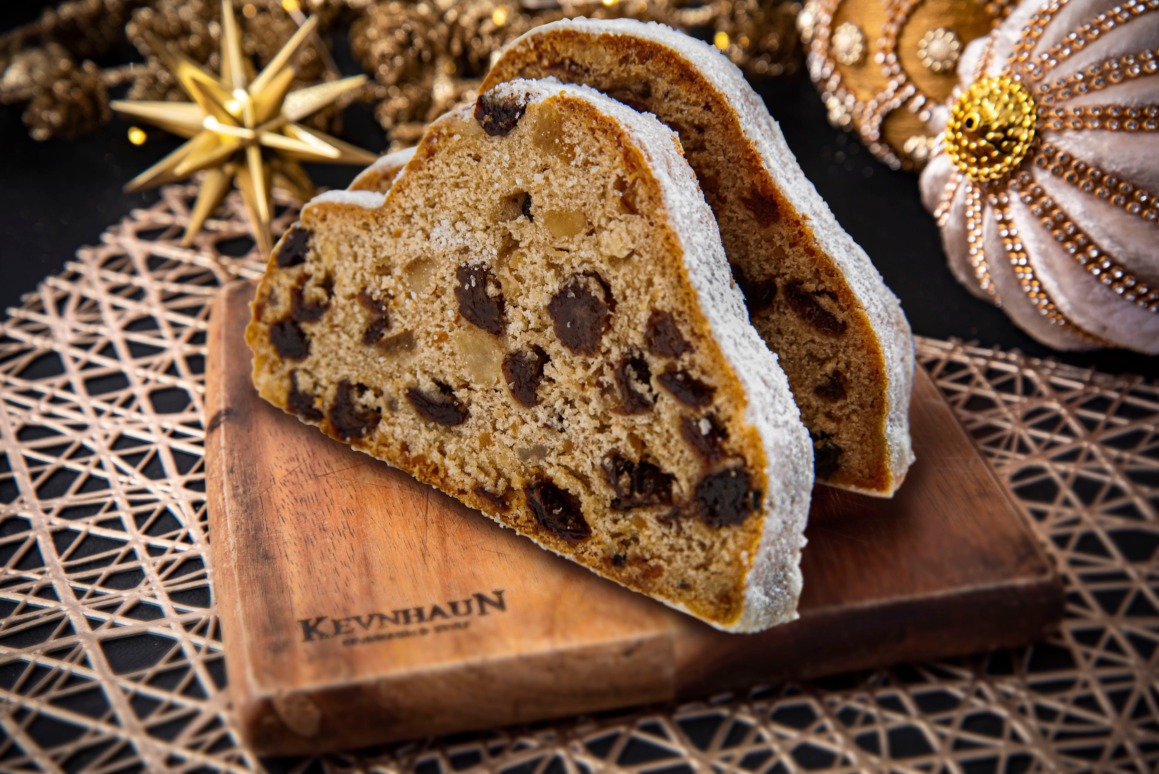 クリスマスを楽しみながら迎えるために、クリスマスの4週間前から毎日一切れずつ食べ始めるというドイツ、ドレスデン発祥の伝統的なお菓子です。その起源は14世紀まで遡ると言われております。長期保存ができるように、バターやナッツ、ドライフルーツを贅沢にパン生地の中に練りこみ、そこにラム酒も効かせているため、時間が経つにつれ、生地に素材の味がなじんで、豊かな風味となり、日々の味の変化を感じながら、クリスマスまでの時間を楽しむことができます。またその形状は、表面にたっぷりと白い砂糖がまぶされていて、白いおくるみにつつまれた幼子のイエス・キリストの姿を象徴していると言われています。
