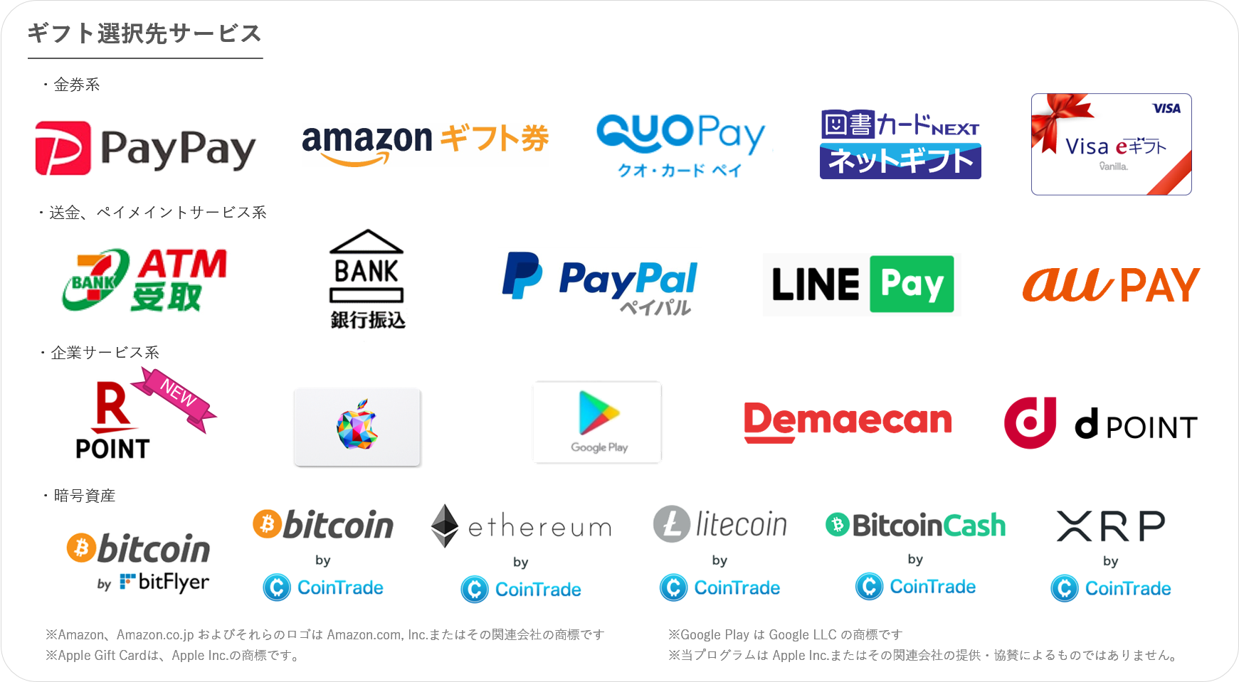 アンケート回答、資料請求、お見積もりの謝礼、社内イベントのインセンティブ、etc.