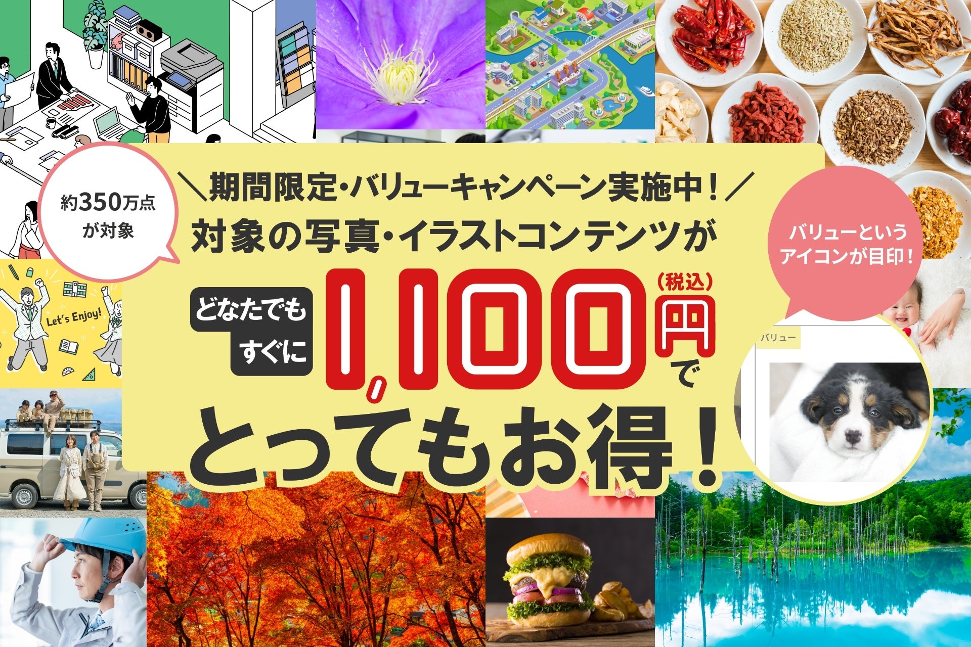 定番のビジネスイメージからCG、イラスト、背景用画像まで、約350万点の制作の現場で使いやすいコンテンツが対象です。