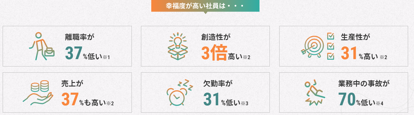 ウェルビーイングとは、⾁体的、精神的、社会的に満たされた状態(持続的な幸福状態)のことを指し、人的資本の情報開示でも注目されている概念です。この幸福度が高い社員は、低い社員に比べて、生産性が高く、離職率が低いということが分かっています。