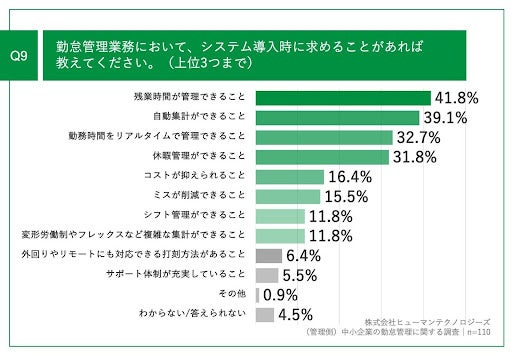 「Q9.勤怠管理業務において、システム導入時に求めることがあれば教えてください。(上位3つまで)」(n=110)と質問したところ、「残業時間が管理できること」が41.8%、「自動集計ができること」が39.1%、「勤務時間をリアルタイムで管理できること」が32.7%という回答となりました。