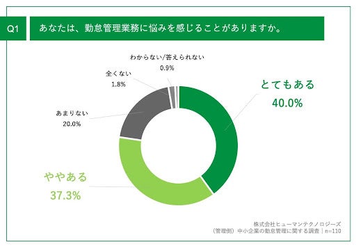 「Q1.あなたは、勤怠管理業務に悩みを感じることがありますか。」(n=110)と質問したところ、「とてもある」が40.0%、「ややある」が37.3%という回答となりました。