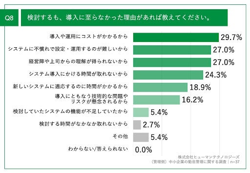 Q7で「過去に検討したことがある」と回答した方に、「Q8.検討するも、導入に至らなかった理由があれば教えてください。」(n=37)と質問したところ、「導入や運用にコストがかかるから」が29.7%、「システムに不慣れで設定・運用するのが難しいから」が27.0%、「経営陣や上司からの理解が得られないから」が27.0%という回答となりました。