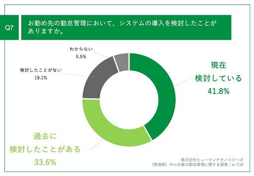 「Q7.お勤め先の勤怠管理において、システムの導入を検討したことがありますか。」(n=110)と質問したところ、「現在検討している」が41.8%、「過去に検討したことがある」が33.6%という回答となりました。