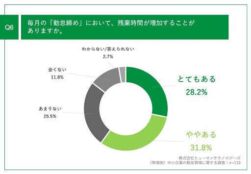 「Q6.毎月の「勤怠締め」において、残業時間が増加することがありますか。」(n=110)と質問したところ、「とてもある」が28.2%、「ややある」が31.8%という回答となりました。