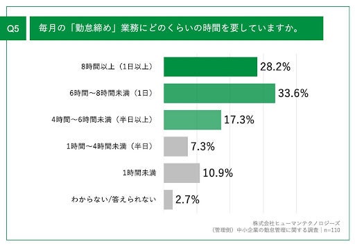 「Q5.毎月の「勤怠締め」業務にどのくらいの時間を要していますか。」(n=110)と質問したところ、「6時間~8時間未満(1日)」が33.6%、「8時間以上(1日以上)」が28.2%、「4時間~6時間未満(半日以上)」が17.3%という回答となりました。