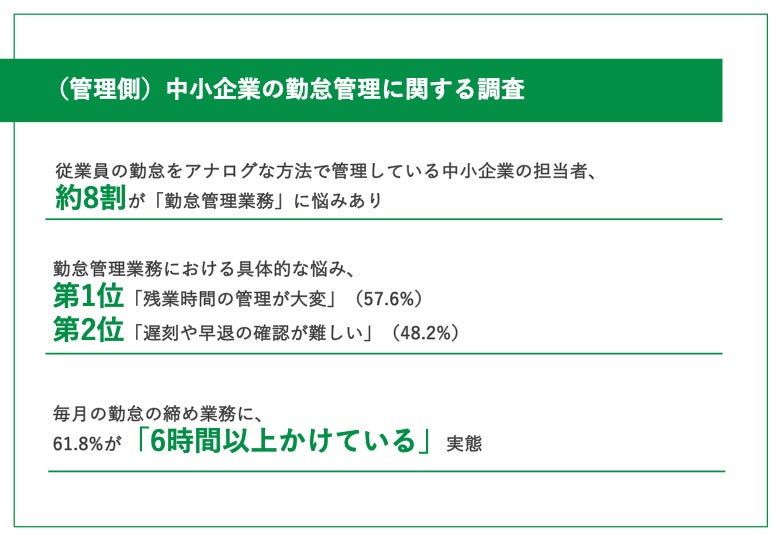 【中小企業の勤怠管理実態調査:前編】管理者の悩み第1位は「残業時間の管理」、毎月の締め作業時間は約6割が「6時間以上」