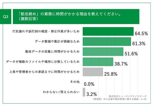 Q2で「勤怠締めに時間がかかる」と回答した方に、「Q3.「勤怠締め」の業務に時間がかかる理由を教えてください。(複数回答)」(n=31)と質問したところ、「打刻漏れや誤打刻の確認・修正作業が多いため」が64.5%、「データ整理や集計が煩雑なため」が61.3%、「勤怠データの収集に時間がかかるため」が51.6%という回答となりました。