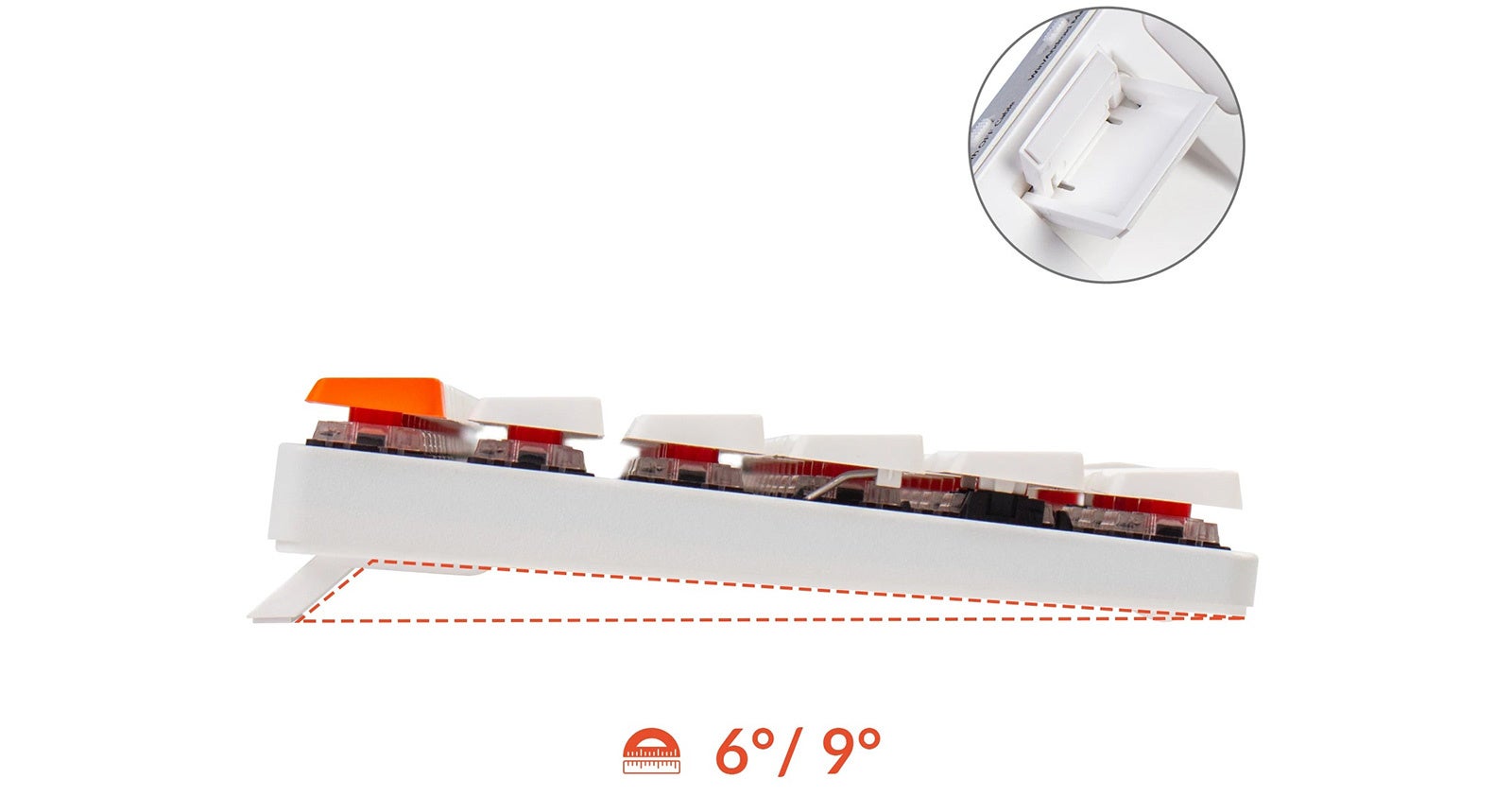 人間工学に基づく角度デザインが考慮され、2段階に調節可能なゴム足がより快適なタイピングを実現。