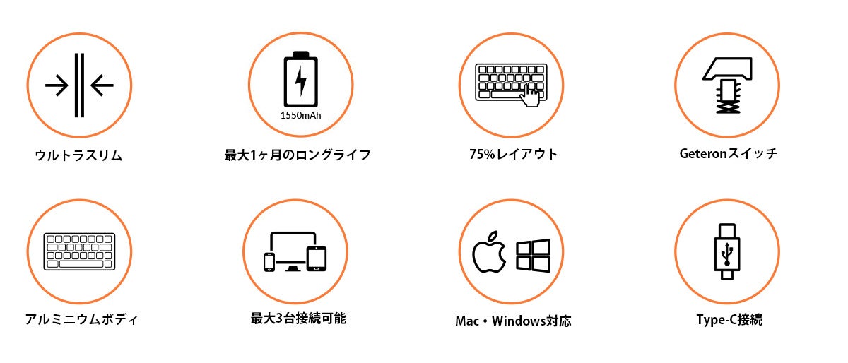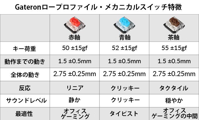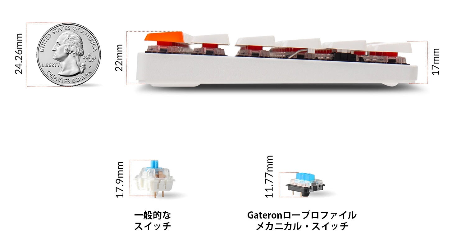 新設計のロープロファイルスイッチは、従来の一般的なスイッチに比べ約40%の薄型化を実現しました。また、アルミ製のボディを採用し、ワイヤレスメカニカルキーボードとして極薄・軽量を実現しています。