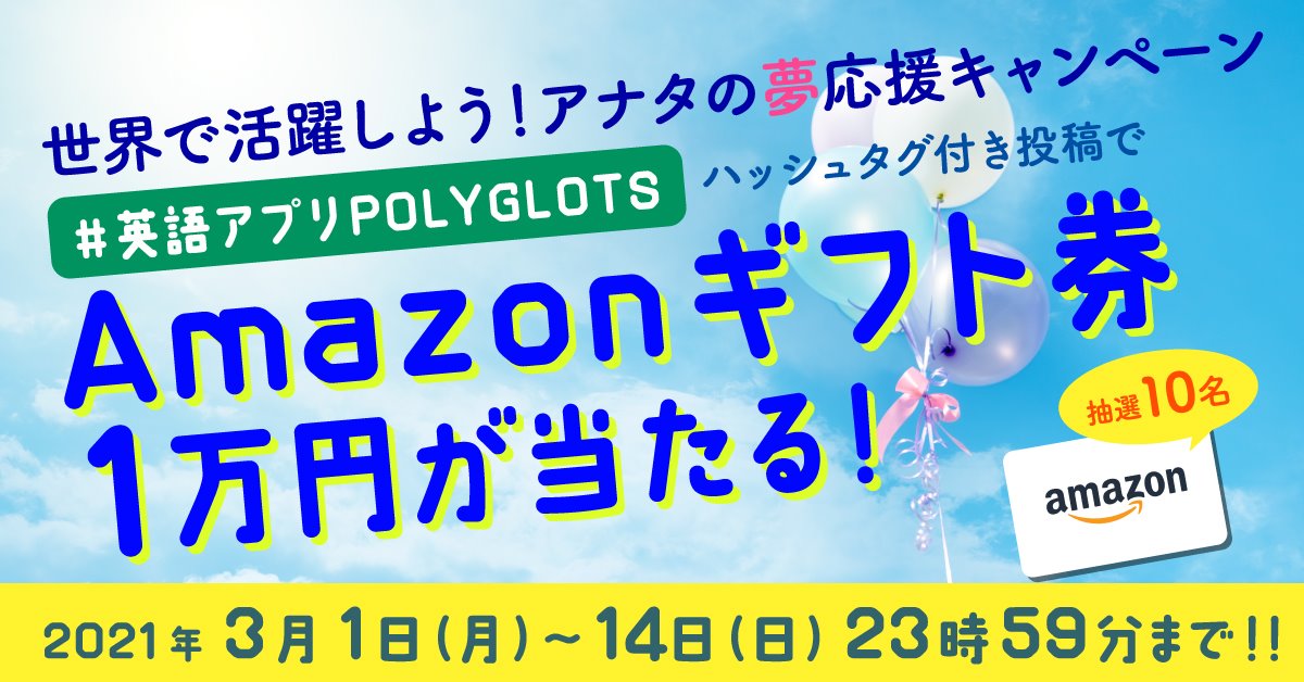 株式会社ポリグロッツ(本社:東京都新宿区、代表取締役:山口隼也)は、言語の壁を超え世界で活躍する日本人が増える事を切望して、3月1日(月)~ 3月14日(日)まで、Twitterキャンペーンを開催いたします。ご応募いただいた方には抽選で、Amazonギフト券1万円分をプレゼントいたします。
