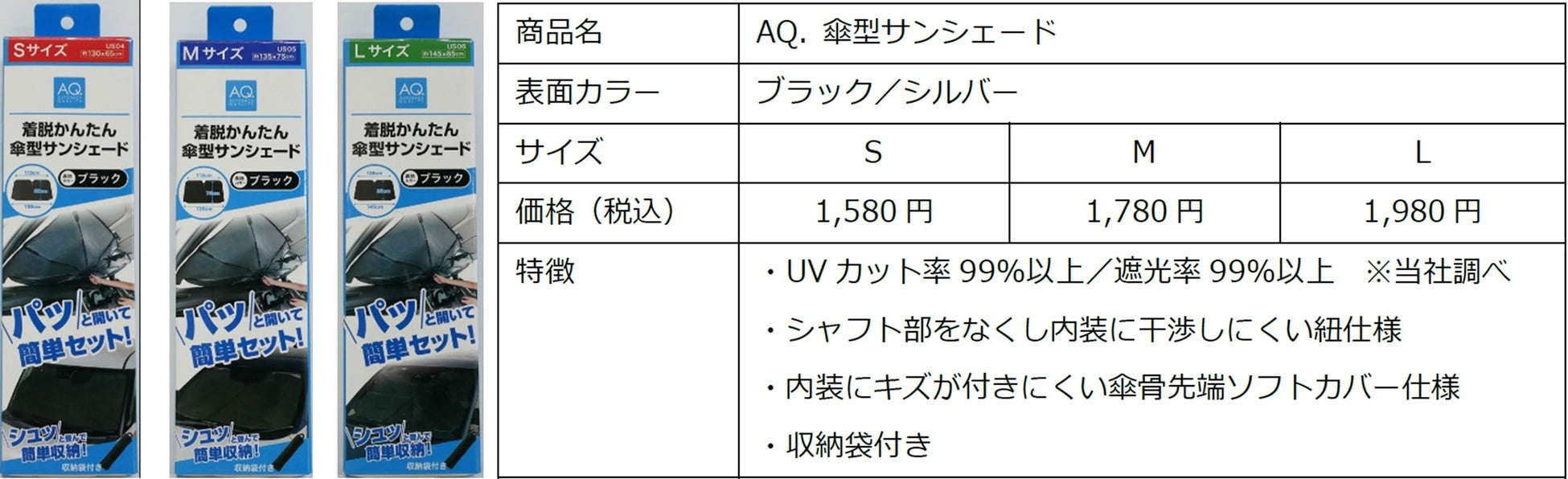 AQ.シリーズから汎用&車種専用の折りたたみ傘型サンシェード新発売