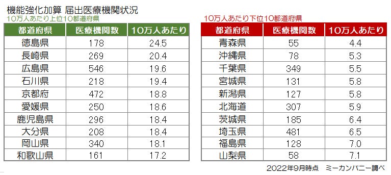2022年9月時点で「機能強化加算」を届出ている医療機関数は、全国で14,789(診療所:13,478 病院:1,311)10万人あたりの医療機関数は、約11.74件(人口データ、令和4年1月1日住民基本台帳) 2022年度診療報酬改定前の調査では、人口10万人あたり12.43件(2021年12月時点、人口データ令和3年1月1日住民基本台帳)と比較して、約0.7 減少しています。