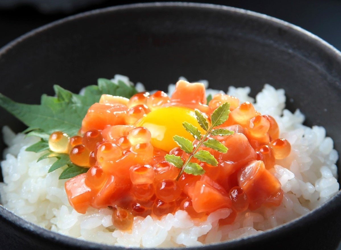 北海道産いくらとトラウトサーモンの身を秘伝のたれに漬け込みました。いくらの食感とトラウトサーモンのやわらかさが絶妙です。温かいご飯に卵黄と一緒にのせ特製丼ぶりに、またお酒の肴としてもお楽しみいただけます。北海道の魅力満載の贅沢な一品です。