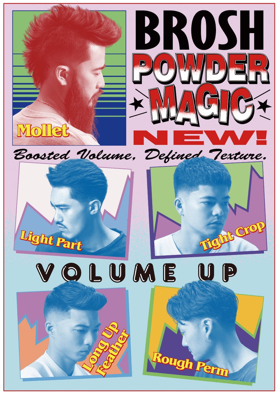 世界のメンズカットの現場を知る日本人スタイリストが開発に携わるBROSHが発信する新たな革新は、クランチやツイストして、馴染ませながら自由自在な動きを楽しむスタイルメイク。髪と髪を引っ掛けて整髪する『粉の魔法“POWDER MAGIC”』で、ポマードやワックスとは異なる新感覚のエアリースタイルをお楽しみください。