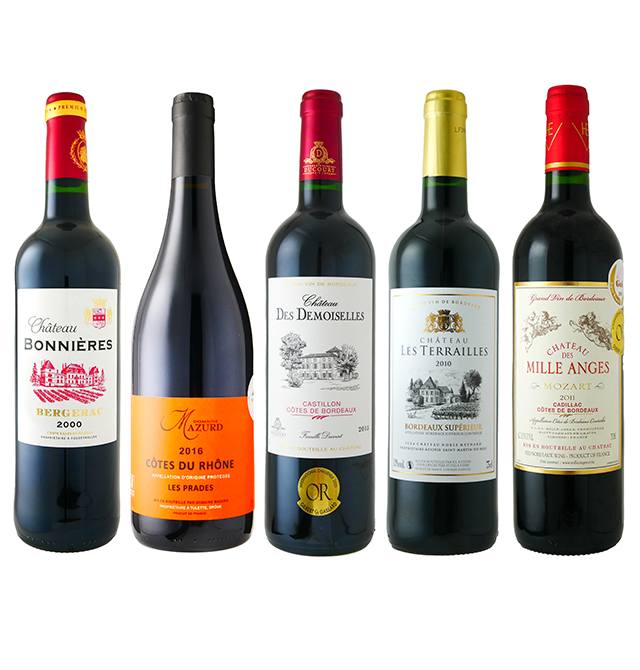「シャトー ボニエール 2000」は長い余韻が魅力。「コート デュ ローヌ レ プラド 2016」は華やかな熟成香とスパイシーで甘みを伴ったまろやかな渋味と風味を感じられます。「シャトー デ ドゥモワゼル 2015」は濃厚な果実味にエレガントさをまとったボディ。「シャトー レ テライユ 2010」は華やかな香りと調和のとれた味わいが魅力です。