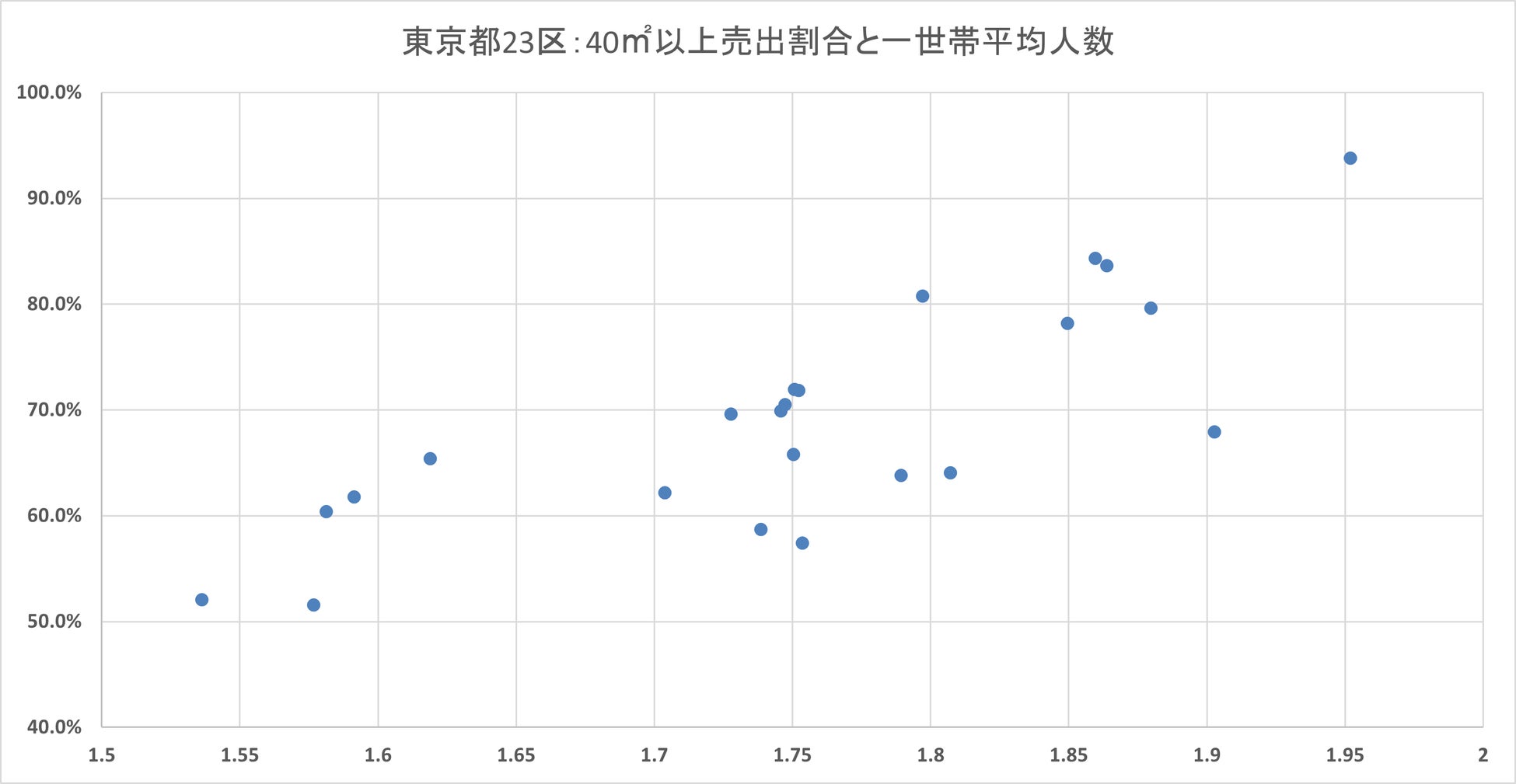 以下グラフ1は40㎡以上(ファミリーマンション)と一世帯平均人数の相関性を調査の結果を示しました。