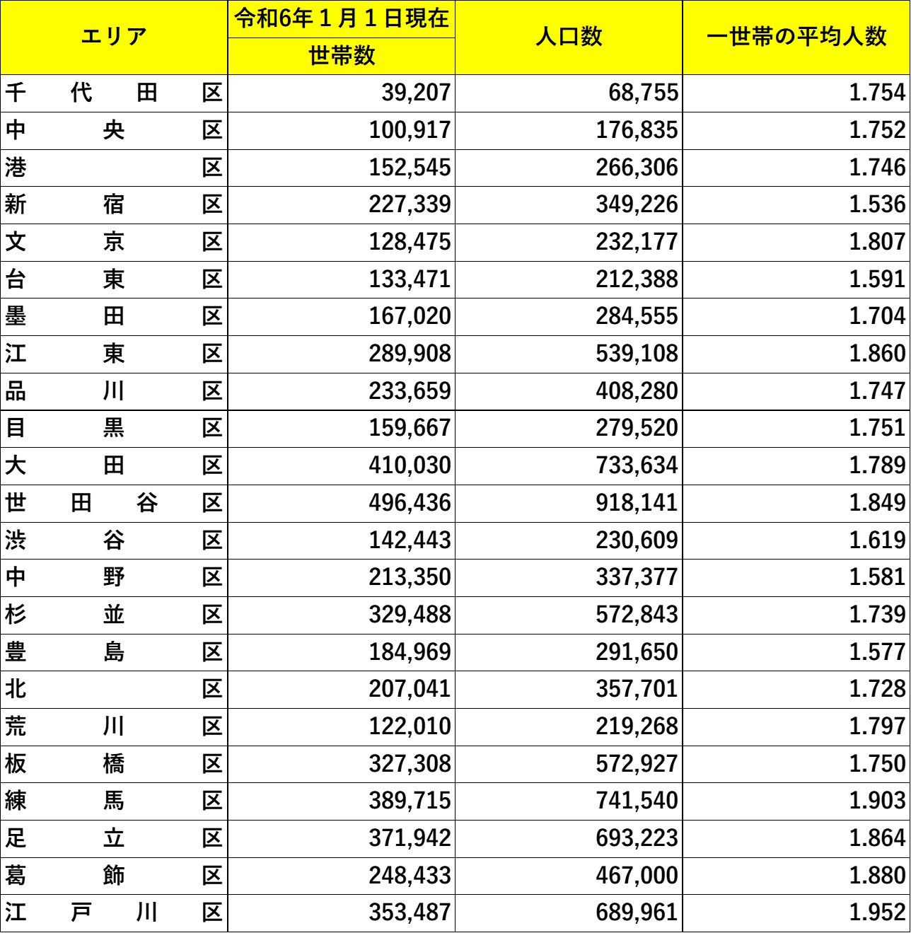 以下の表は東京都23区各区の世帯数、人口数、1世帯の平均人数を示しています。