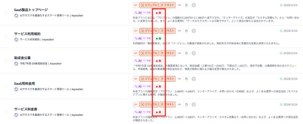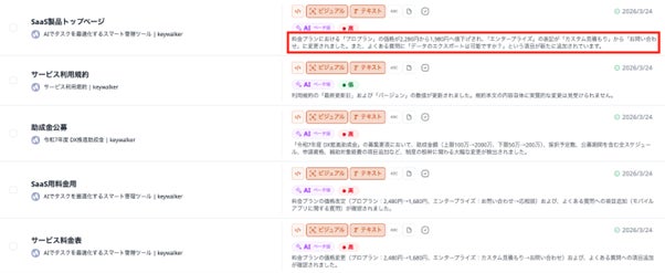 新たに「AI要約機能」も搭載いたしました。本機能では、AIが更新情報を自動で解析し、要点をテキストベースでまとめて通知します。これにより、これまで発生していた「1ページずつ内容を確認する手間」を解消することができるようになり、ユーザーは要約を確認するだけで、膨大な情報の中から「必要なアクション」のみに注力することが可能になります。
