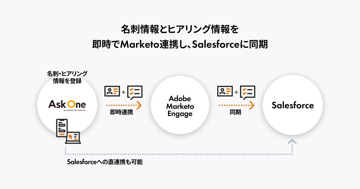 Ask Oneは、Adobe Marketo EngageとSalesforce両システムとの連携に対応しており、またAdobe Marketo EngageのPMCF(Program member custom field)へのデータ連携や、キャンペーン情報の割り当てなど要望に合わせた柔軟な連携設定が可能です。従来は名刺情報のデータ化に数日のリードタイムが発生していましたが、Ask Oneを導入したことでリアルタイムに名刺とヒアリング情報をAdobe Marketo Engageに連携できるようになり、従来のデータ管理の体制を変えることなく顧客フォローのリードタイム短縮を実現しました。
