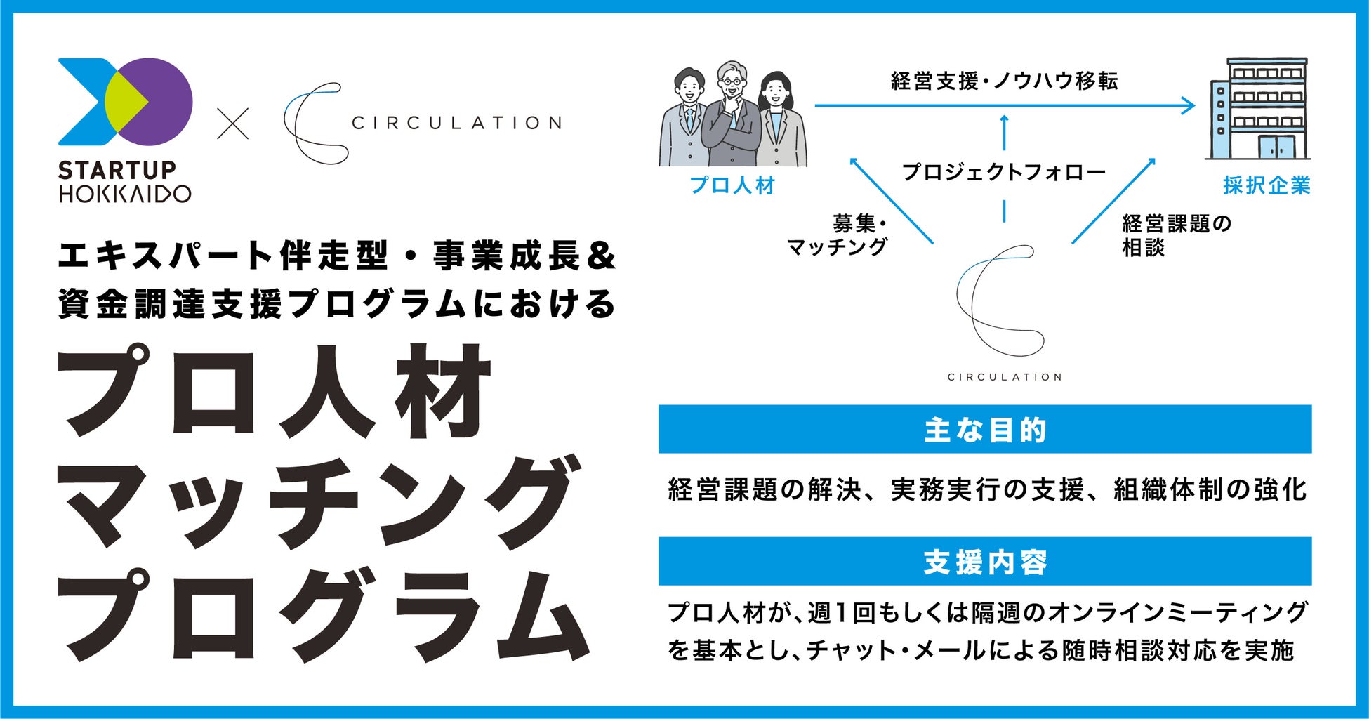 また、サーキュレーションは2025年2月に北海道支社を開設し、企業の課題解決と成長の推進を加速してきました。本事業では、サーキュレーションが保有するプロシェアリングの仕組みを活用し、道内スタートアップが抱える高度な経営課題に対し、最適な経験を持つプロ人材をマッチング・伴走支援することで、事業成長の加速と北海道発ユニコーン企業の創出に寄与することを目指します。
