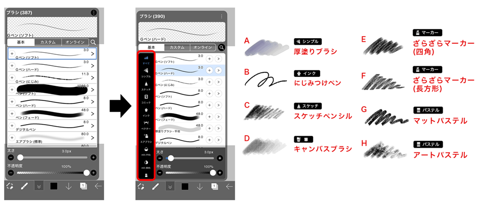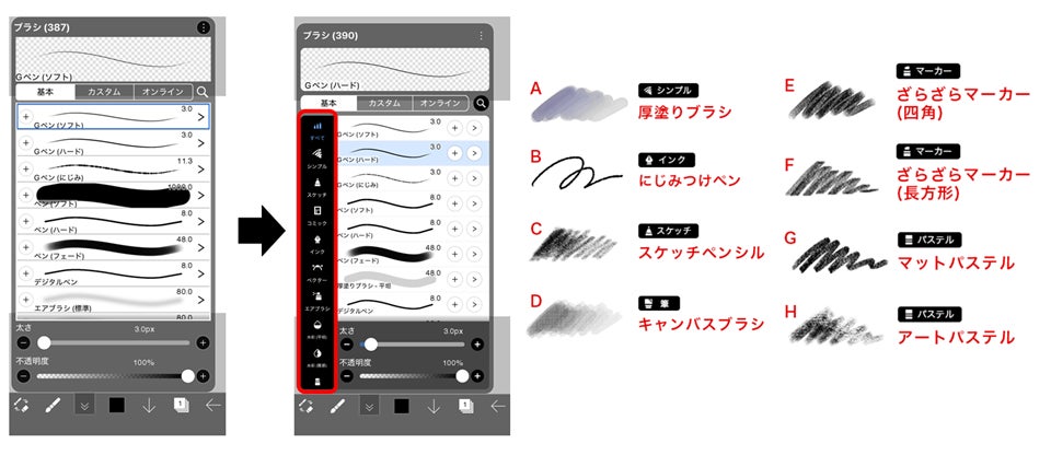 ■基本ブラシのカテゴリ化・新ブラシ追加・筆圧調整など描画体験を総合的に向上