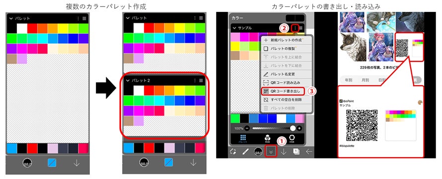 色の並べ替え機能に加え、QRコード※1を利用したパレット共有にも対応しています。