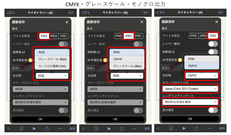 PNG:RGB/グレースケール/モノクロ2階調 JPEG:RGB/CMYK/グレースケール PSD:RGB/CMYK