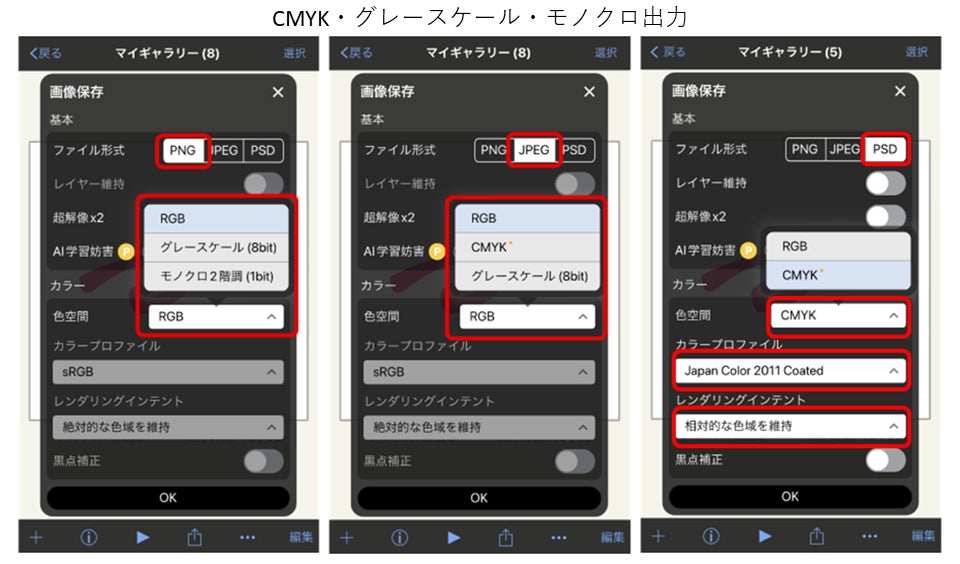 JPEGおよびPSD形式での出力時にCMYKプロファイルを選択できるようになり、同人誌制作や商業印刷などの印刷用途に対応した書き出しをアプリ内で完結できるようになりました。