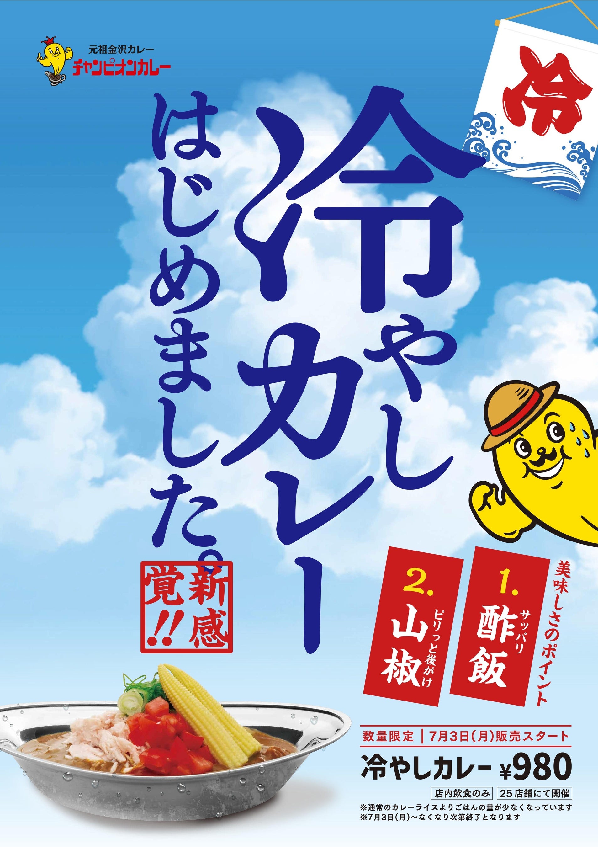 株式会社チャンピオンカレー(本社:石川県野々市市、代表取締役:南 恵太)は、2023年7月3日(月)より、限定メニュー「冷やしカレー」を直営・FC店23店舗で販売いたします。食欲がない暑い夏の日でも食べられるカレーを目指しました。ごはんもルーも冷たい!だけど、美味しい!新感覚のカレーを是非お試しください!
