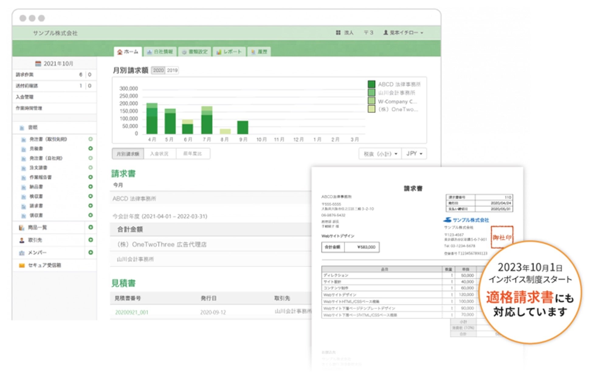 見積書や請求書をはじめとする書類を場所を選ばず作成でき、承認、郵送代行や電子送付、入金管理や売上レポートの表示ができます。2018年にリコーグループに参画してからは、中小企業の請求書の電子化の改善策として根強い人気を誇っています。