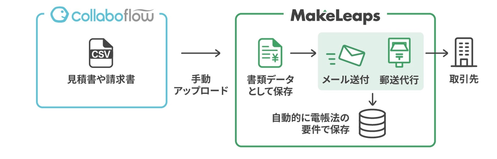 今回のサービス連携を利用することにより、「コラボフロー」より出力した請求書データを簡単に「MakeLeaps」に連携します。連携したデータは書類情報として登録されるため、書類作成後の郵送・電子送付や入金業務が「MakeLeaps」で一元管理できます。