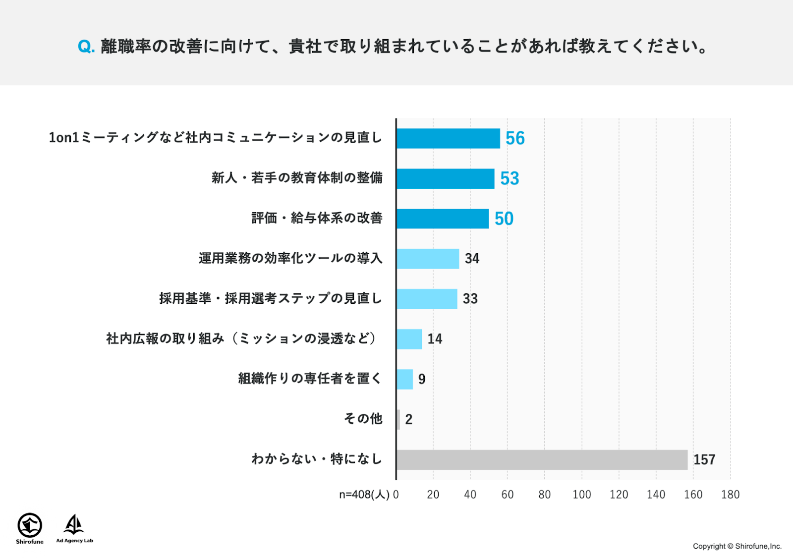 - 離職対策として、「社内コミュニケーションの見直し」「新人・若手の教育体制の整備」