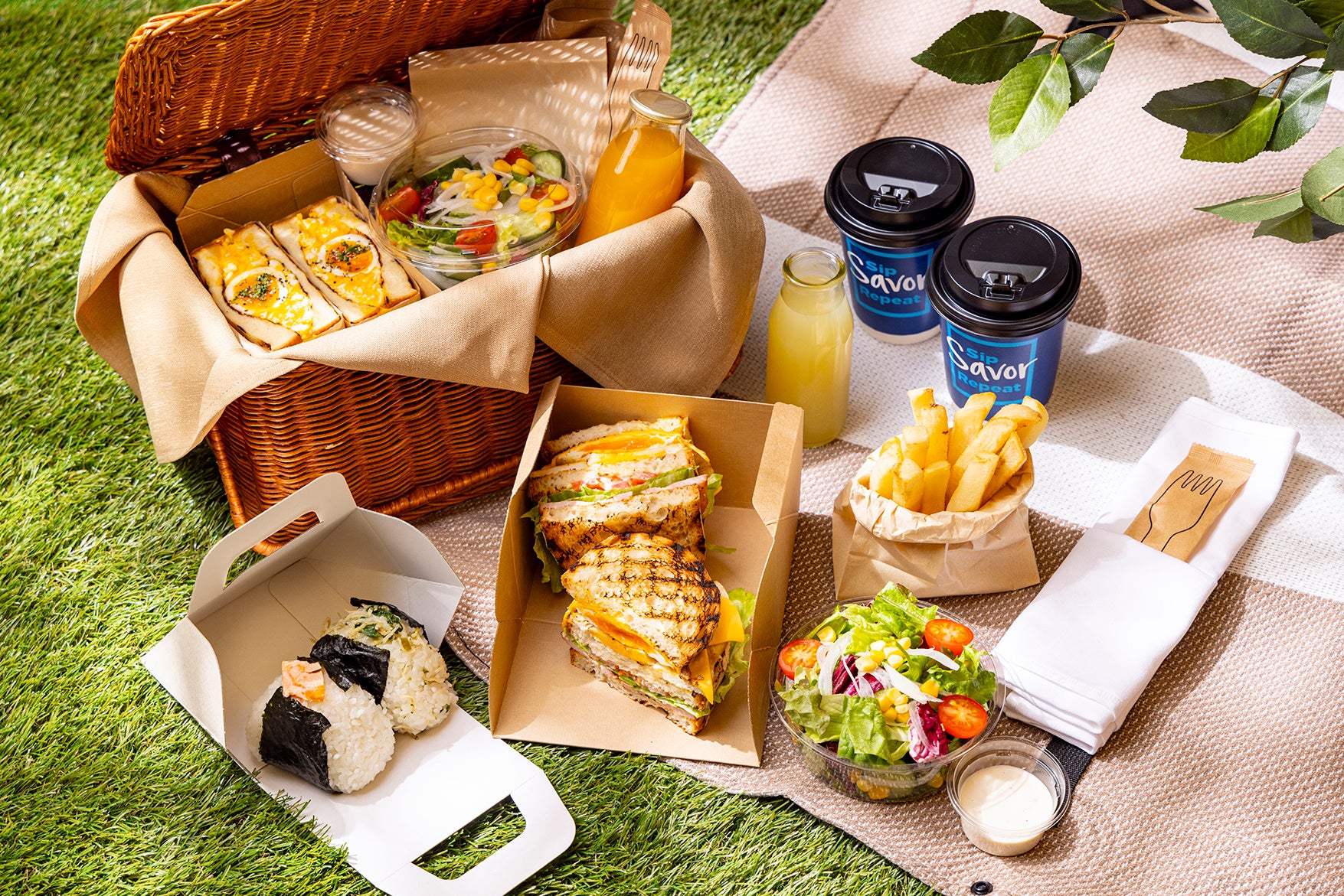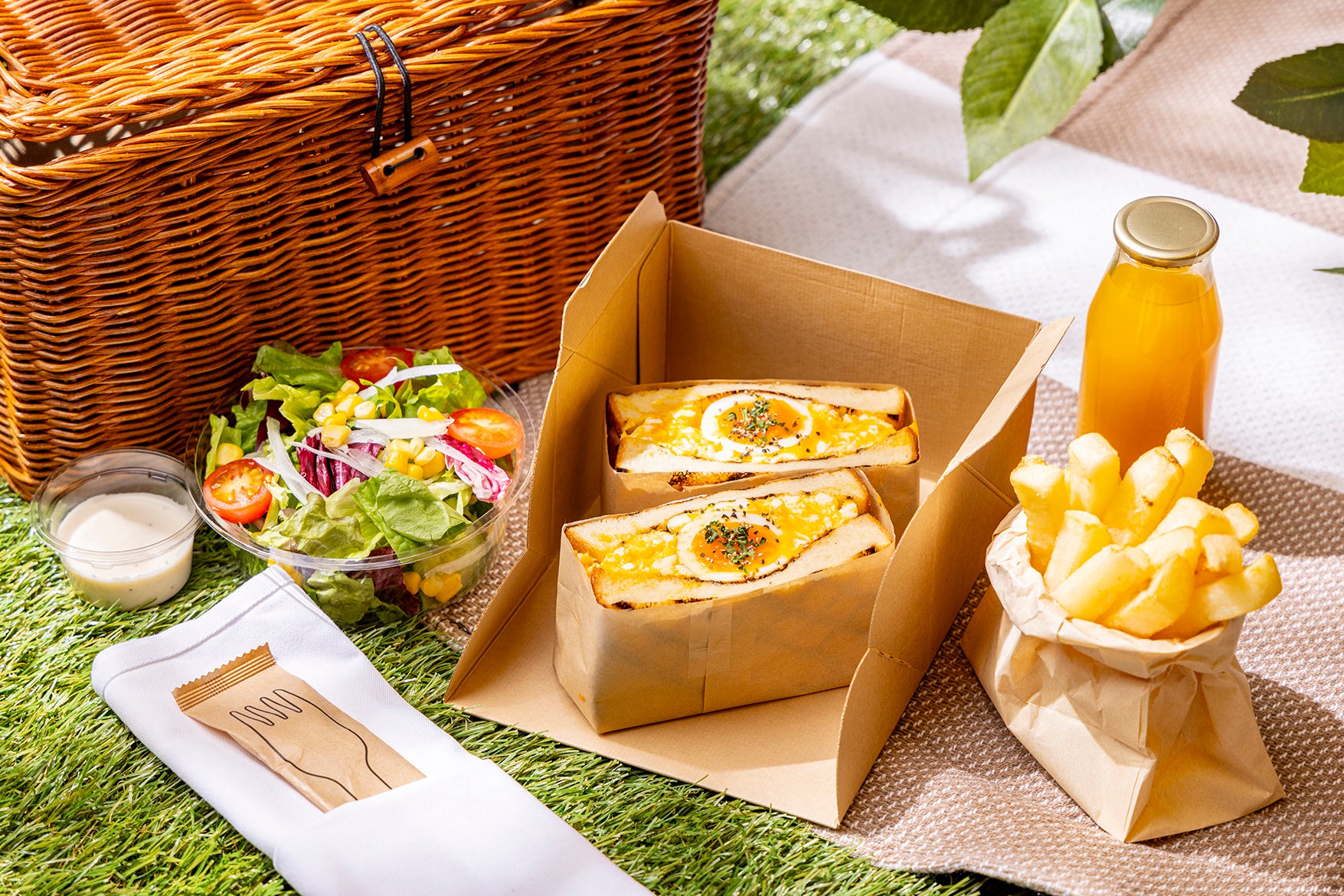 特別なピクニックに欠かせない上質なホテルメイドのランチメニューは、3種からおひとつ選べるメイン、彩り鮮やかな新鮮野菜のサラダとホクホク食感のフレンチフライに選べるドリンクがセットになっています。メインは、甘さとコクのある平飼い卵のみを使用した濃厚な卵フィリングを、軽くトーストしたもちもちの湯ごね食パンで贅沢にはさんだ「究極のたまごサンドウィッチ」、ベーコン、グリルチキン、フライドエッグ、チェダーチーズ、シャキシャキのレタスとトマトをはさんだ食べ応え満点の「クラブハウスサンドウィッチ」、そして、ふっくら炊き上げた「ヒルトン小田原オリジナル米」で地域の特産と定番の具材をにぎった大きな「しらすと青菜、焼鮭のおにぎり2種」の3種から、ドリンクはコーヒー、紅茶、オレンジジュースとアップルジュースから、それぞれおひとつ選ぶことができるのでお子様とご一緒に楽しみたいファミリーにもぴったりです。