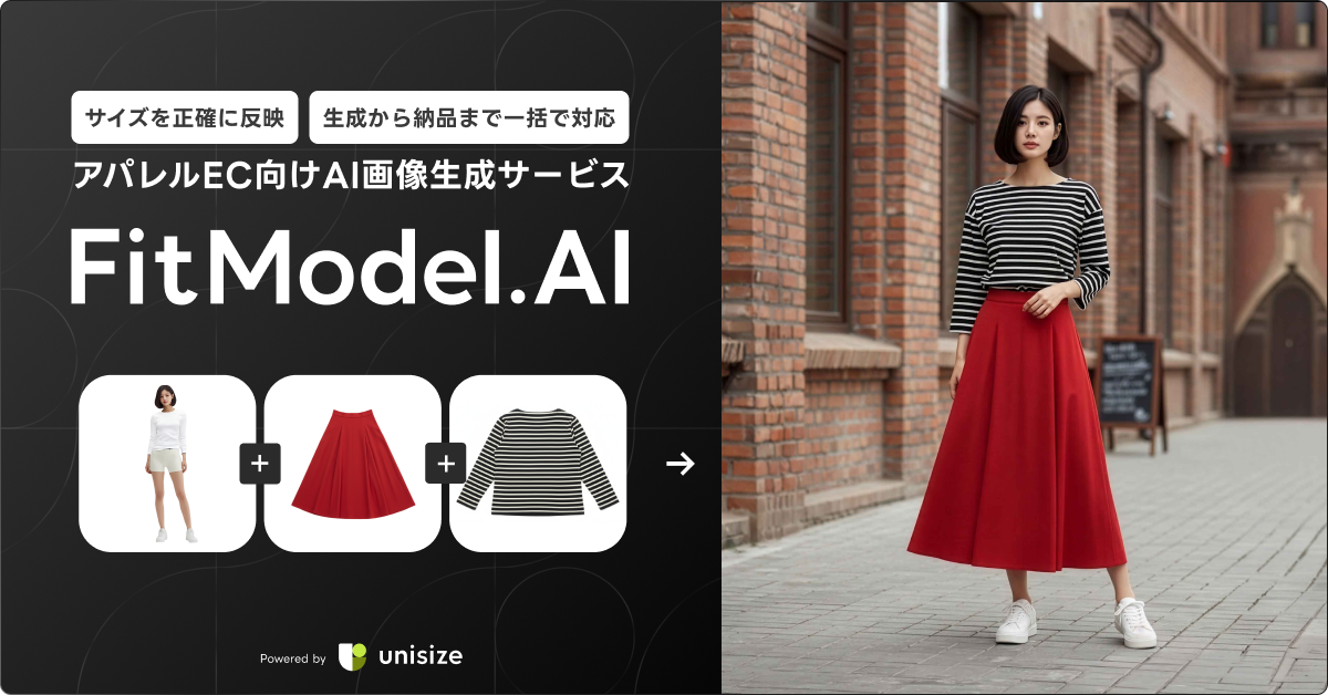 当社はサイズレコメンドエンジン「unisize」の提供を通じて、ユーザーひとり一人に正確なサイズ感を届けることに向き合い続けてきました。そうした中、unisizeをご利用いただいているクライアント様から「サイズに向き合ってきたメイキップで、サイズ感まで反映したAIモデル画像が作れないか」というご相談をいただきました。これをきっかけに、unisizeで培ったサイジング技術と蓄積されたサイズデータを生成AIと掛け合わせ、撮影なしでも着丈・袖丈を1cm単位で再現できるAI画像生成サービス「FitModel.AI」を開発いたしました。