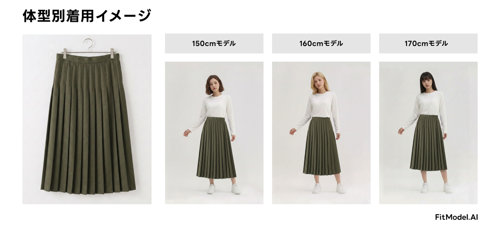 unisizeで培ったサイジング技術と蓄積されたデータをもとに、着丈・袖丈・ゆとりを1cm単位で再現したモデル着用画像を生成します。たとえば「身長160cmの人が着丈80cmのスカートを履いたとき、裾がどの位置にくるか」まで正確に再現します。これにより「着たときのサイズ感」を正確に反映し、ユーザーがECサイト上で商品の着用イメージを具体的に確認できる画像を提供します。