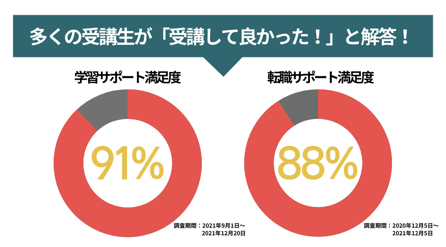- 学習サポート満足度91%、転職サポート満足度88%を達成!