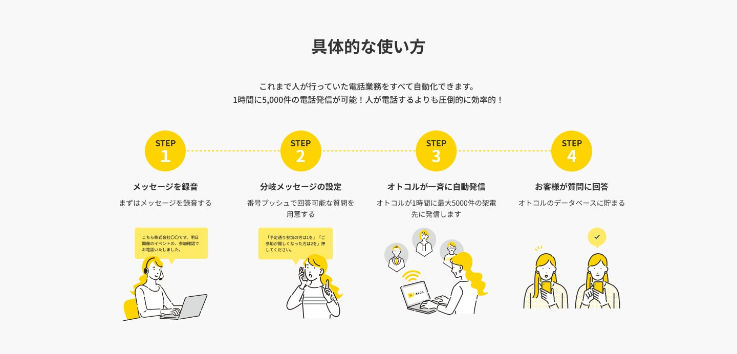 当社が提供する自動架電ツール「オトコル」は電話発信業務を自動化するサービスです。あらかじめ録音した音声を、指定の電話番号リストへ一斉に自動発信し、アンケート方式でお客様の回答を収集します。予約確認電話、催促電話、市場調査、営業活動などさまざまなシーンでご活用いただけます。